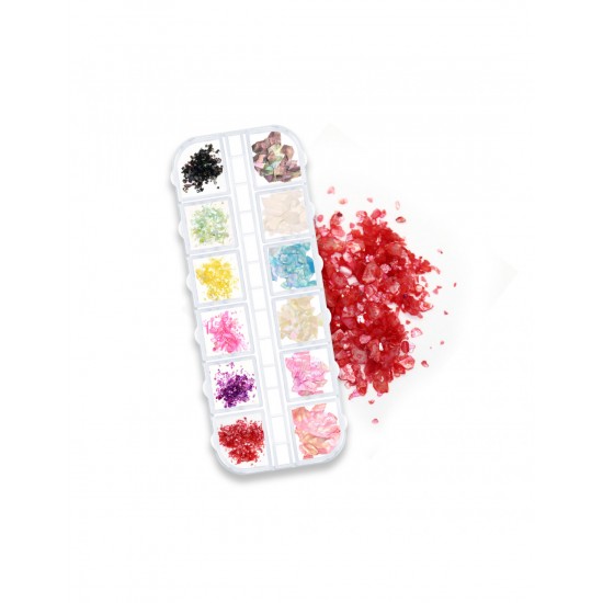 Δημιούργησε μία καλοκαιρινή διάθεση στο nail art σου με μία ξεχωριστή παλέτα 12 θέσεων από πολύχρωμα κομμάτια από κοχύλι! Έξι χρώματα από μεγάλα και έξι από πιο θρυμματισμένα κομμάτια σε μία μόνο παλέτα! Μια διασκεδαστική και απλή διακόσμηση νυχιών που κάνει τα νύχια σας όμορφα! Mπορείτε να εφαρμόσετε αυτές τις πούλιες με κοχύλια νυχιών σε φυσικά ή τεχνητά νύχια και αυτά τα στολίδια μπορούν να συνδυαστούν με τα περισσότερα βερνίκια νυχιών με τζελ , ακρυλικά και acrygel ! Ένα κουτί με 12 διαφορετικά χρώματα και δύο διαφορετικά μεγέθη.